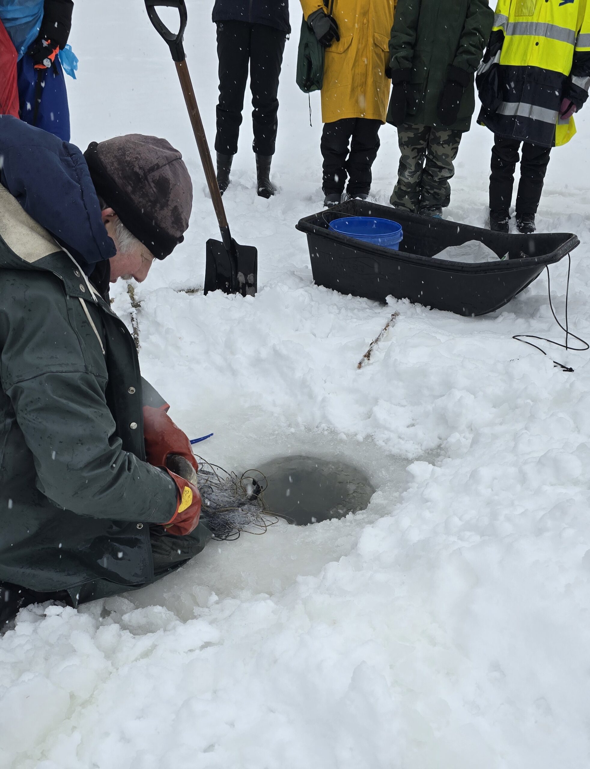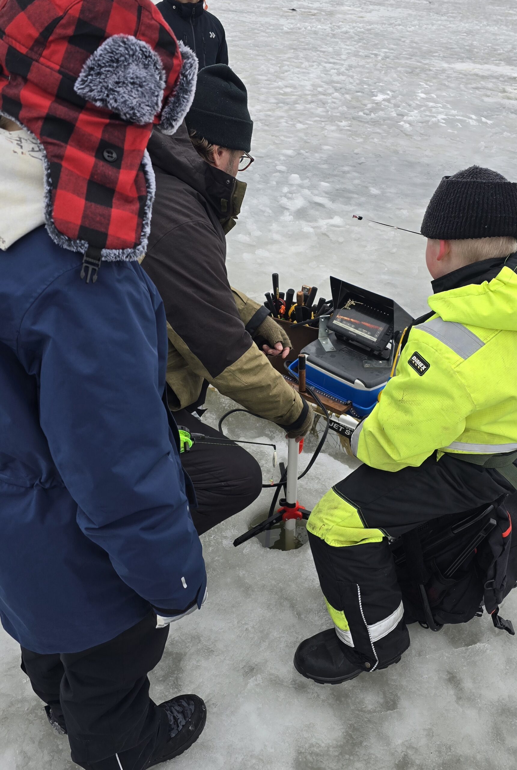 Paikalliset koululaiset suuntasivat jäälle opettelemaan kalastuksen alkeita. Kaikkiaan noin 90 lasta neljänä eri päivänä. Päiviin mahtui niin aurinkoa kuin räntäsadettakin, mutta kun varusteet ovat kunnossa, ei säällä niin väliä. Yhtenä päivänä paikallinen kalastaja esitteli meille myös talviverkoilla kalastamista.